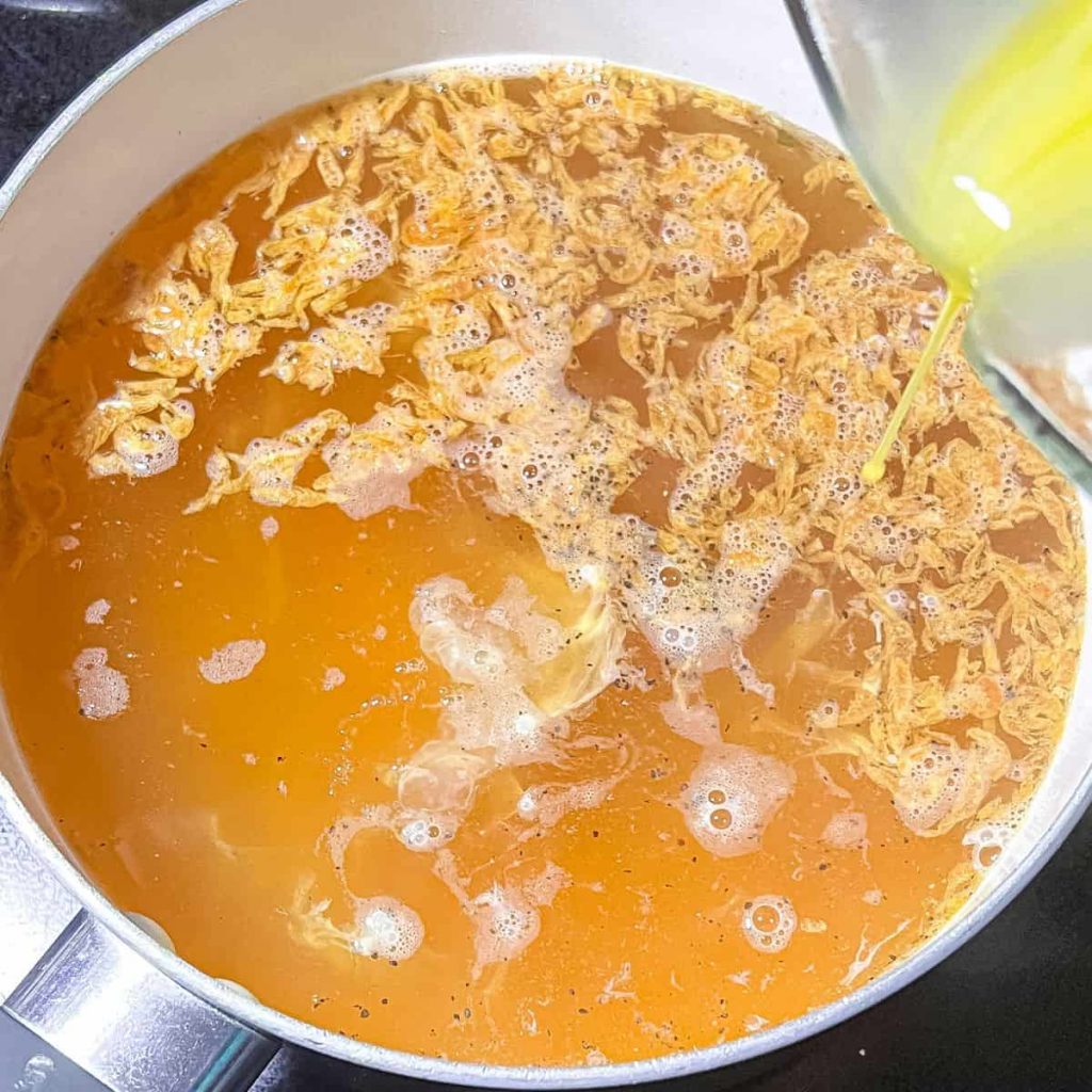 • In a saucepan over medium heat, pour chicken stock or water and bring it to a boil. Add in the dried shrimp (if using), salt, and black pepper. Stir and bring it to a boil again.